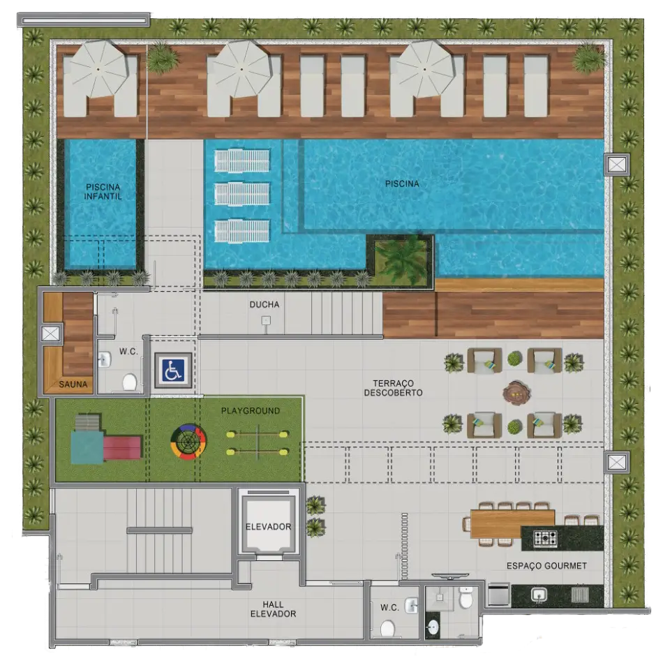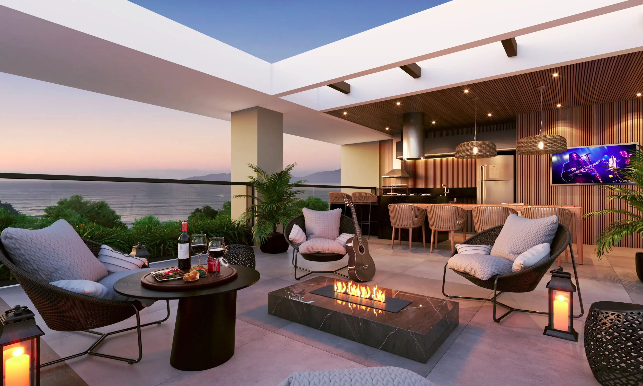 Todos os apartamentos contam com varanda gourmet com churrasqueira a carvão, piso porcelanato, bancadas em granito e infraestrutura completa para ar-condicionado. A área de lazer no rooftop inclui piscina, solarium, espaço gourmet, sauna, lavanderia compartilhada e muito mais — ideal para quem busca viver com facilidade e estilo no litoral.